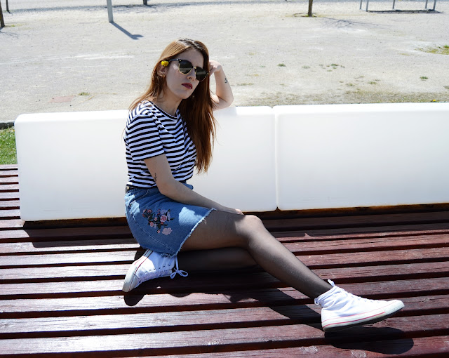¡Hola a todos! Hacía muchísimo tiempo que no me pasaba por aquí... este curso me está absorbiendo todo el tiempo y más. Como hoy hacía muy buen tiempo por Zaragoza, he aprovechado para enseñaros una falda que me enviaron hace un tiempo. Es una falda vaquera, normal y corriente, a la cual han añadido los detalles de las flores todo muy primaveral. Yo la he combinado con un top de rayas que compré el pasado fin de semana. Es bastante cortito, así que si no queréis correr el riesgo de que se os vea nada... yo me pillaría una talla más. Me puse unas zapatillas tipo converse (llevo este calzado 24/7) y después le robé a mi hermano su chaqueta roja. Me atrevería a decir que la he llevado más veces yo que él! Como accesorios llevo un bolso en forma de cangrejito, y los pendientes que os enseñé en el post anterior (sí, los de Amaia de España pero en versión chinorris).